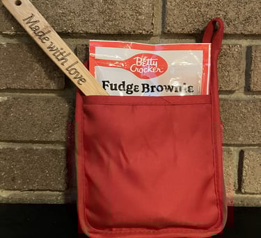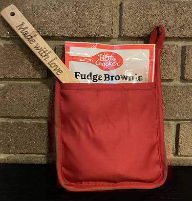 A pot holder that includes an engraved wooden spoon, allowing you to add a dessert mix or any other item for customization. An ideal gift for a teacher, neighbor, or anyone who enjoys baking. $7 each
